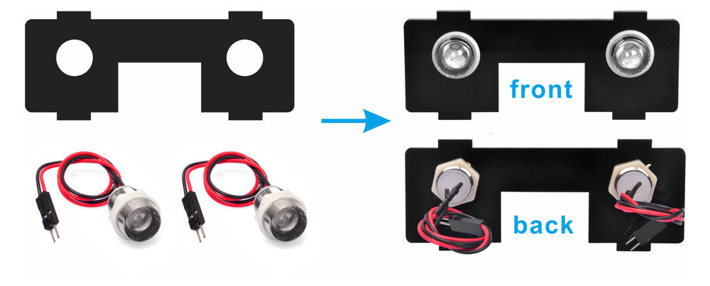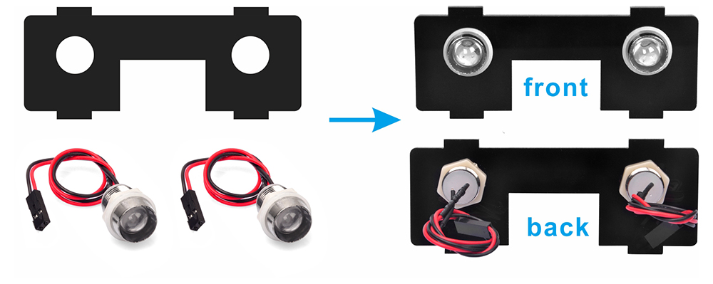 12) Mount two LED lights onto the front barrier plate as shown in the diagram.