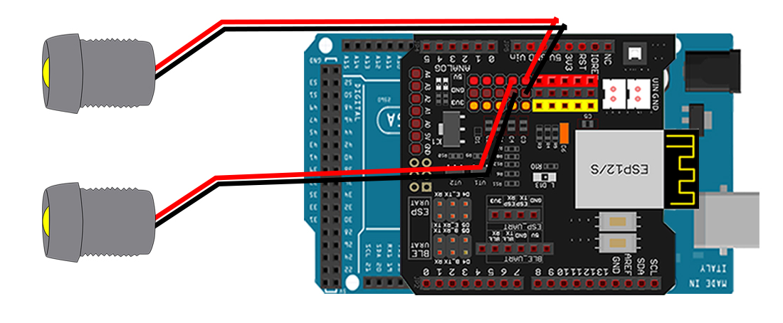 Connect the red wires (VCC) of the LED lights to the 3V or 5V pins, and the black wires (GND) to the GND pins on the UART WiFi shield.