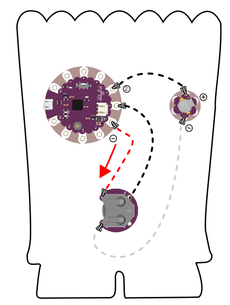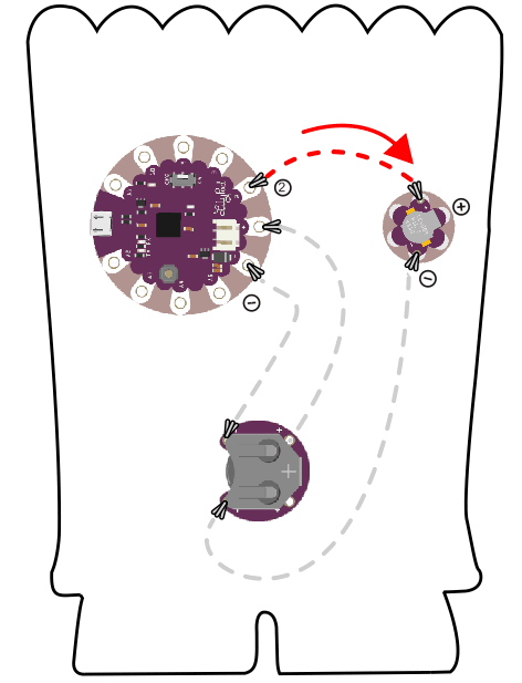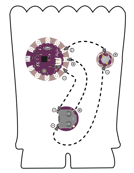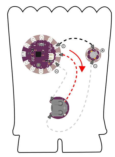 Insert the coin cell battery into the LilyPad USB Board’s battery holder with the positive (+) side facing up. Press the power button on the LilyPad USB Board, the lilypad buzzer will play a simple song. If so, remove the battery and continue to the Finishing Touches section.