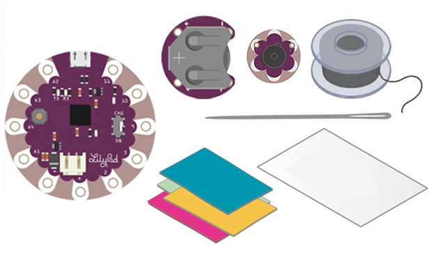 In this project, you will need three LilyPad pieces: the LilyPad USB board, LilyPad buzzer and a LilyPad Coin Cell Battery holder or AAA battery box.