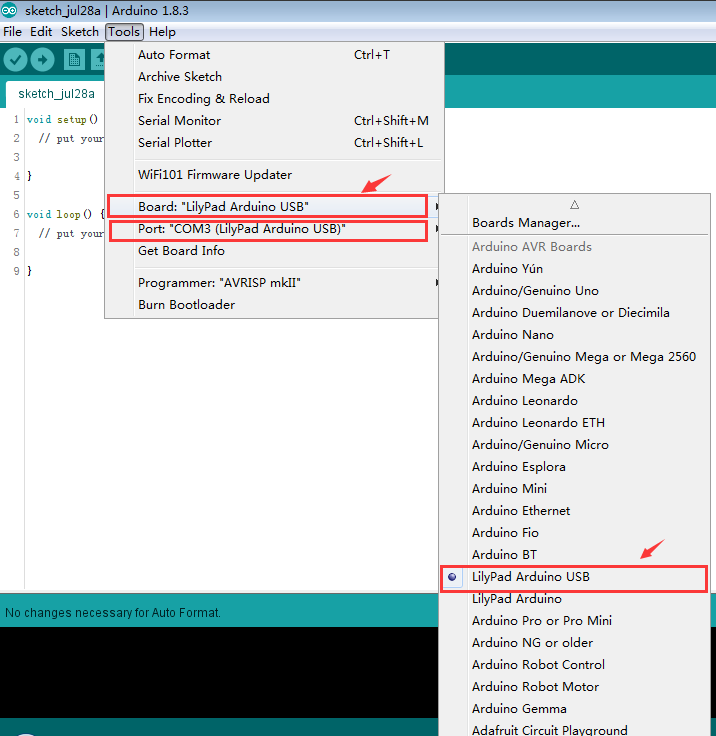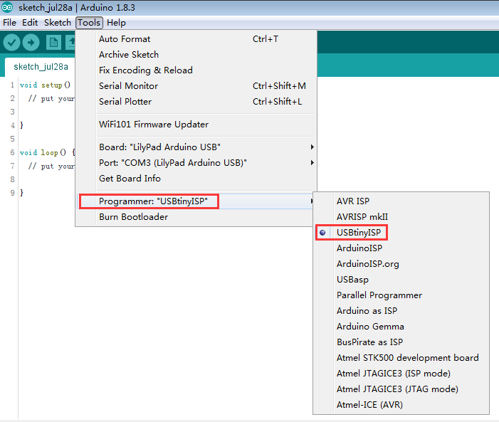 Before you can upload code, there are a few settings to make. Notice that “Board” is correctly set as “LilyPad ArduinoUSB”,“Port” is set as “LilyPad Arduino USB”. Then Select “USBtinyISP” from the Tools > Programmer.