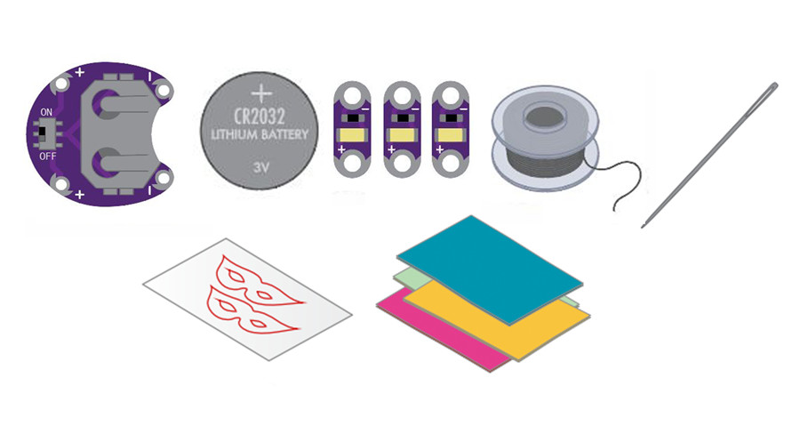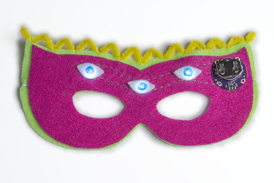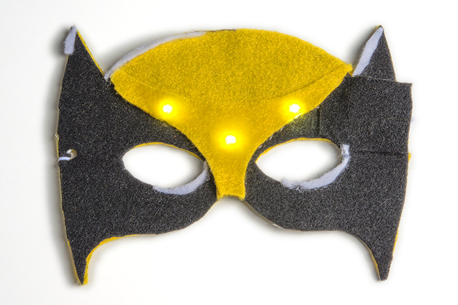For this project, we’ll be using multiple LEDs in a circuit to create an illuminated mask. Rather than stitching just one LED to the battery holder (as we did in the Glowing Pin project), we’ll use a parallel circuit to connect all of the LEDs to the battery.