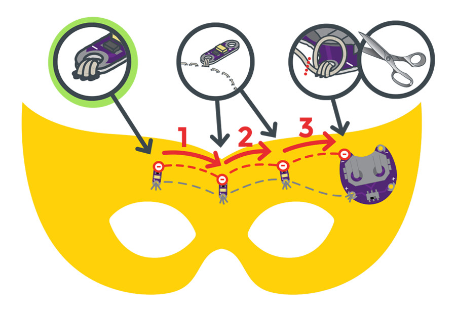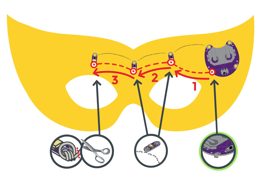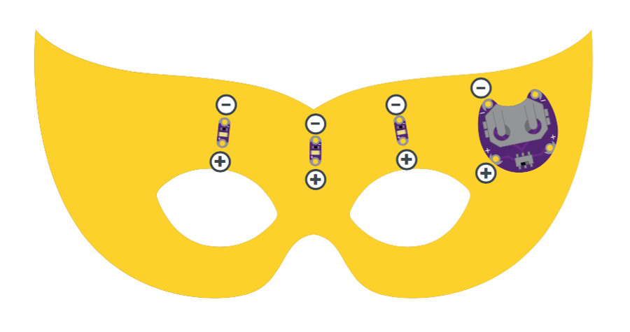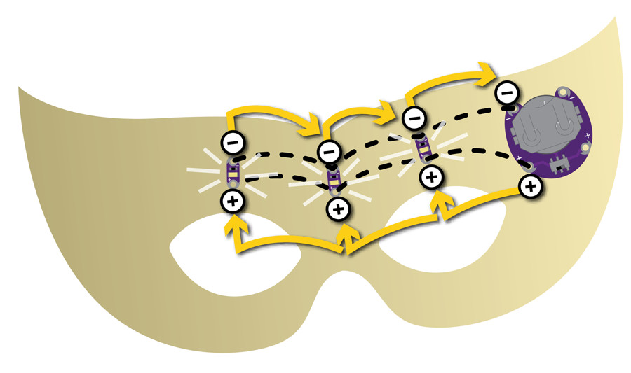 To light up the mask, we will be connecting the LEDs to the battery holder with conductive thread using a parallel circuit layout. In a parallel circuit, components are connected to get the same amount of power running through them. Each LED in the mask will shine as brightly as the others by sharing a connection to the battery. Most of the e-textiles projects we make use parallel circuits.