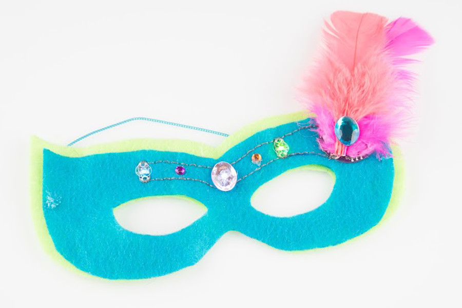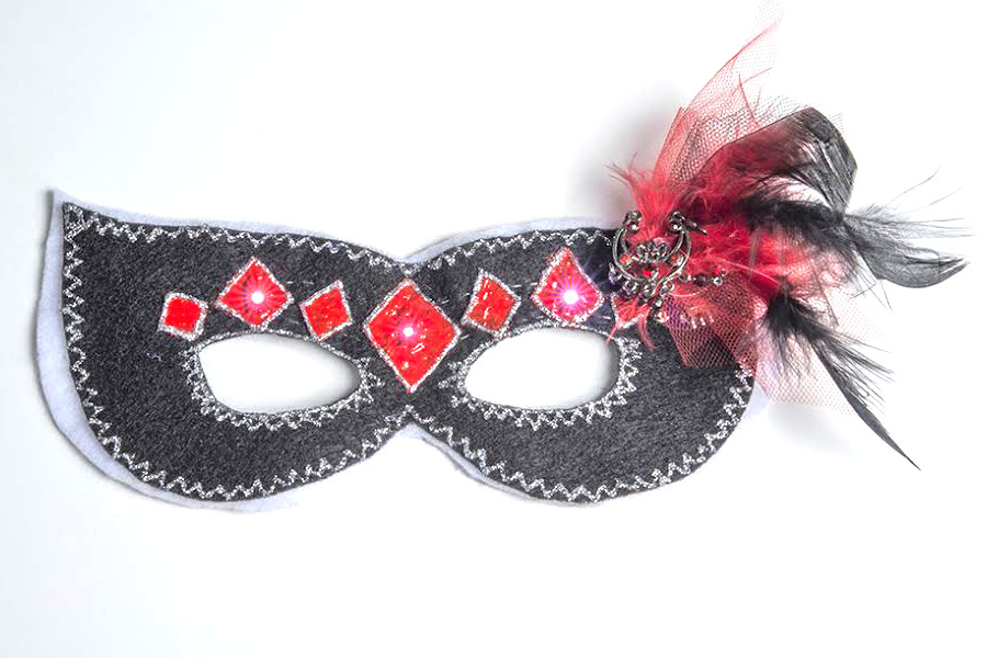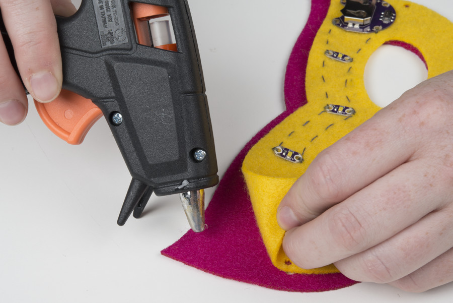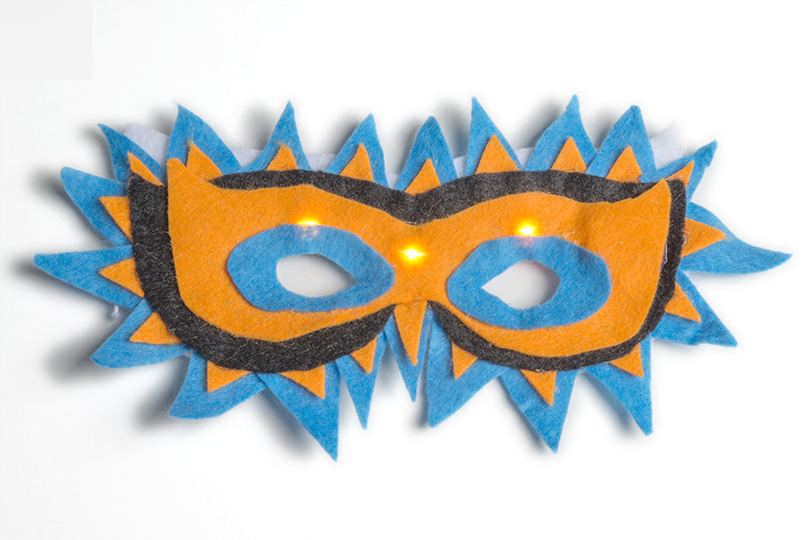 After you’ve checked your circuit, it’s time to get creative with adding some details to the mask. With the battery removed, glue the second layer of felt on the back of the mask to add some extra stability and insulate the back of the circuit.