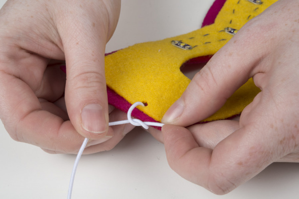 Next, cut small holes on either side of the mask with scissors or a hole punch, and tie the elastic to hold the mask on.