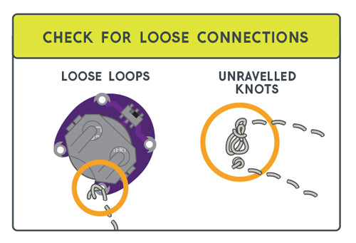 If the conductive thread is not making a tight connection to the LilyPad piece’s sew tabs, current will not be able to flow through consistently. If the project moves, the conductive thread may pull away from the sew tab and disconnect the circuit. To fix, pull stitching tight with tweezers or a needle if possible. You may also sew over the top of existing thread to create more tension and hold the thread securely to a sew tab.