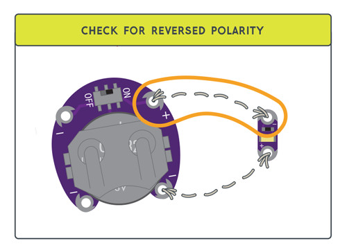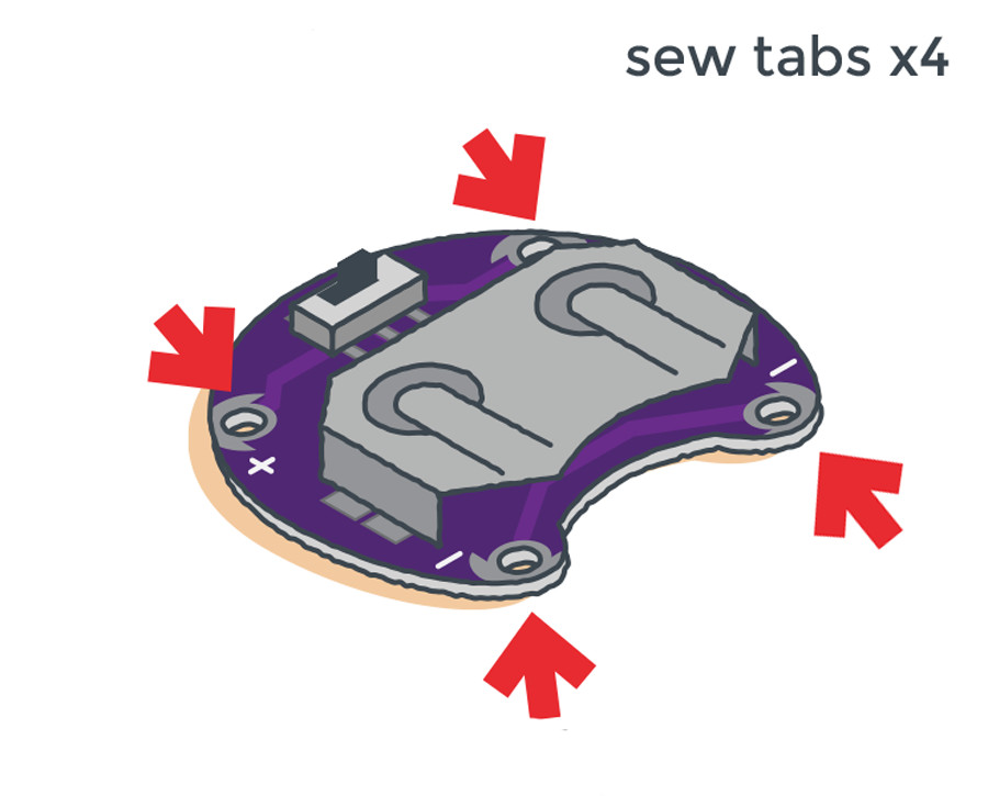 Some LilyPad components are polarized, meaning electric current can only flow through them in one direction. If sewn into the circuit incorrectly, they will not function. Double check the labeled sew tabs before you stitch to make sure they are oriented correctly.