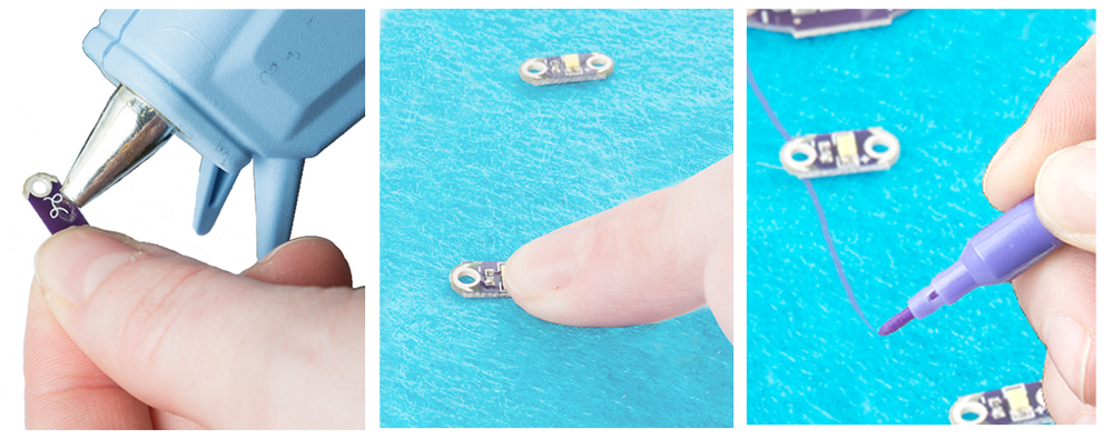 We recommend using a small dot of hot glue (preferred) or fabric glue to attach each LilyPad piece to the fabric to keep it from moving while you sew. Make sure not to accidentally seal up the holes in the sew tabs.