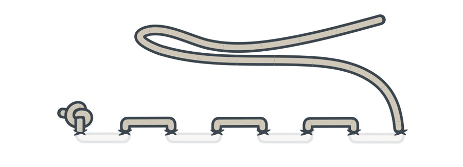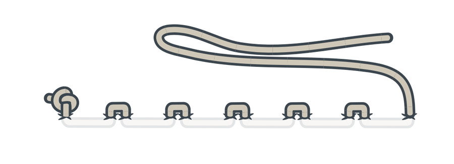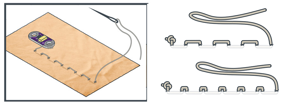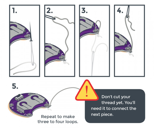 After sewing loops around a sew tab, a running stitch will enable you to connect LilyPad pieces together with a continuous length of conductive thread.