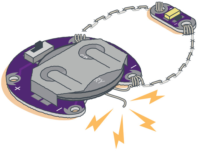 After completing the conductive thread connections, switch your circuit on, and see what it can do! If the circuit fails to work, you may have a short, a loose connection, a reversed component, or even something as simple as a dead battery.