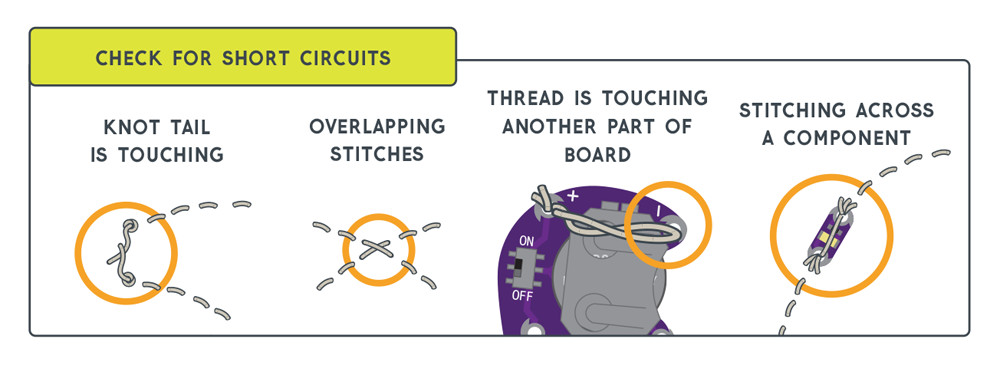 Watch out for any loose threads or knot tails in your project. If any piece of the conductive thread from the positive (+) side of your circuit accidentally touches the negative (–) side, it can cause a short circuit. A short circuit connects the battery to itself and bypasses the rest of your project causing an unwanted amount of current draw from the battery. Stitching directly over stitches in another part of the circuit can also cause a short.