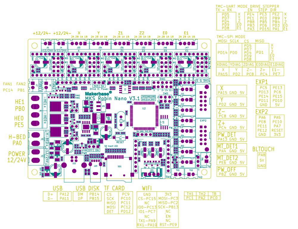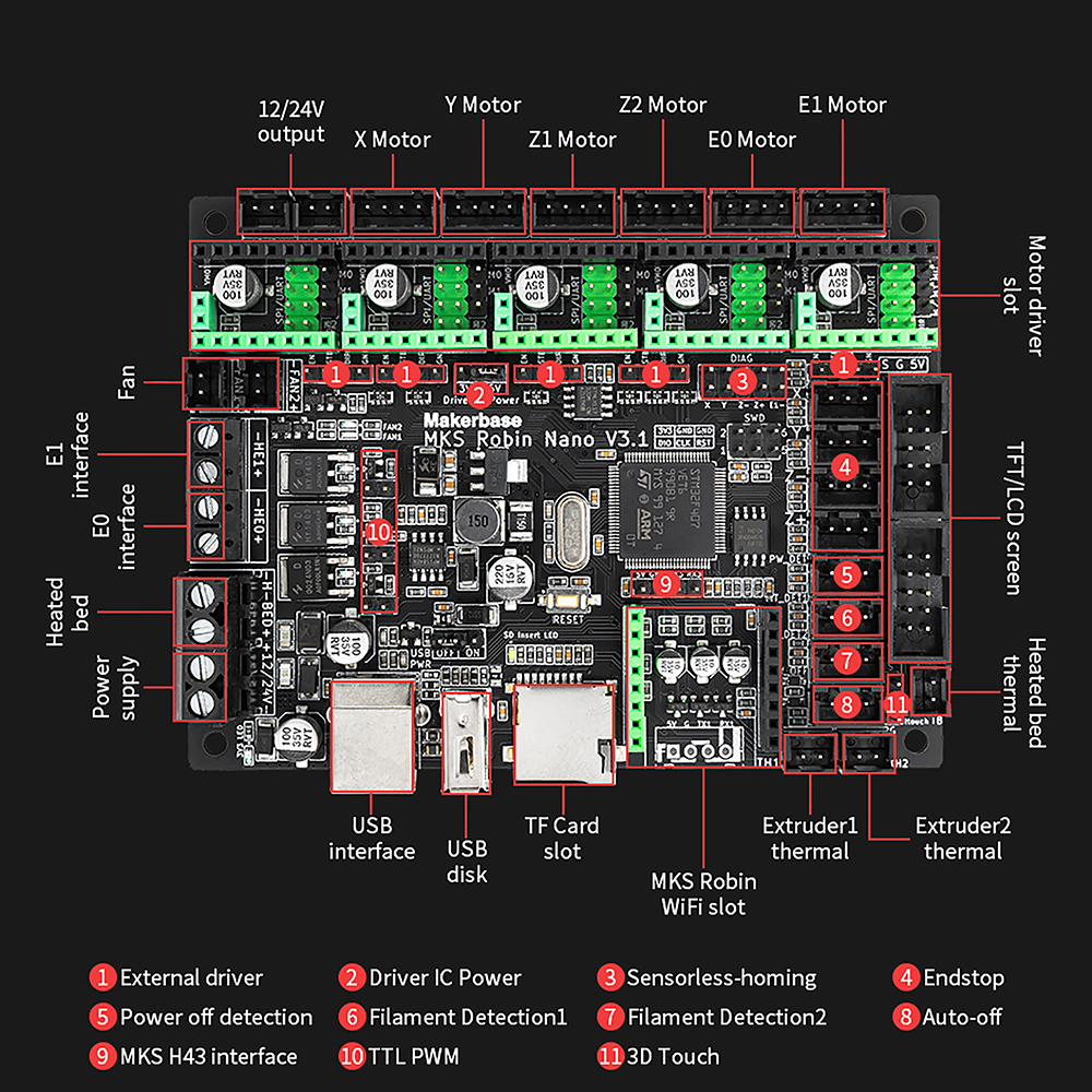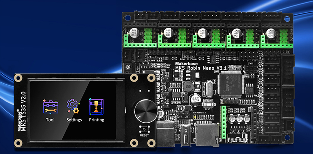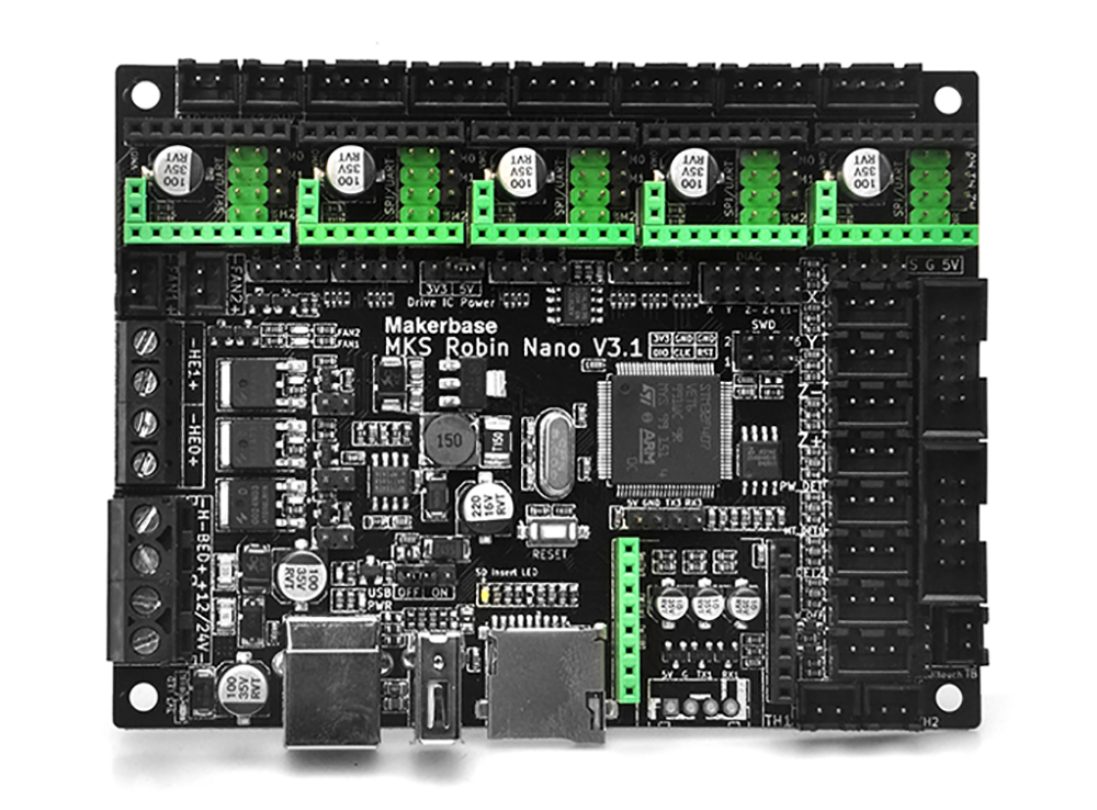 The MKS Robin Nano V3.1 is a 32-bit STM32F407-based 3D printer controller board with support for up to five stepper driver sockets (X, Y, Z, E0, E1) and dual-Z configurations. It works with popular firmware such as Marlin, Klipper, and Reprap, and supports MKS touchscreens like TS35. Its flexible I/O interfaces, stable power design, and rich expandability make it suitable for DIY and modified printers requiring reliable motion control and advanced features.